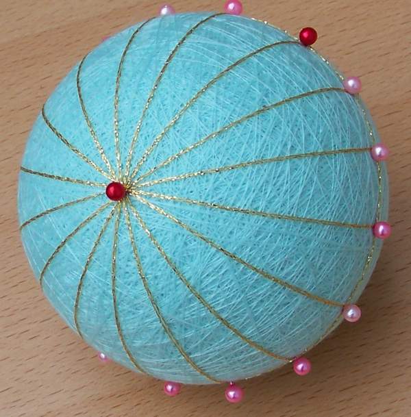 О-кей, продолжаем. У вас теперь должен быть темари с двумя вышитыми на нем рядами, по одному вокруг каждого полюса, вы должны были использовать самый светлый цвет из вашей подборки. Это - первый ряд звезды кику методом Увагаке Чидори Кагари.